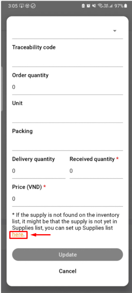 If a new product has not been updated in the system, you need to add it to the "List of Supplies" at “Settings” item. Alternatively, you can update it while in the "Add Item" at “Create Goods received note” section of the "Goods Receipt" page.