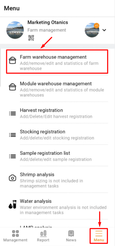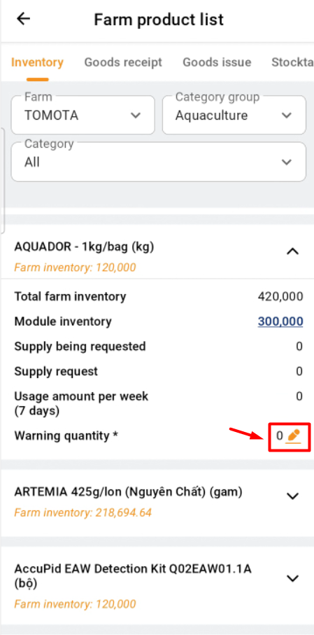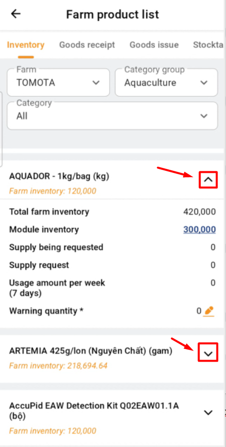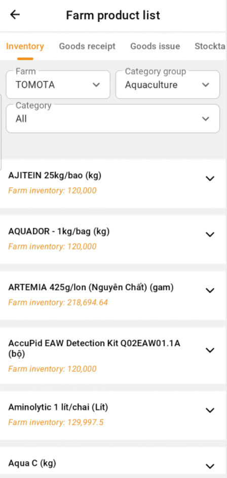 Access to “Module warehouse management” at “Menu” item, choose Farm and Module to receive inventory, next choose the "Category group" and “Category”.