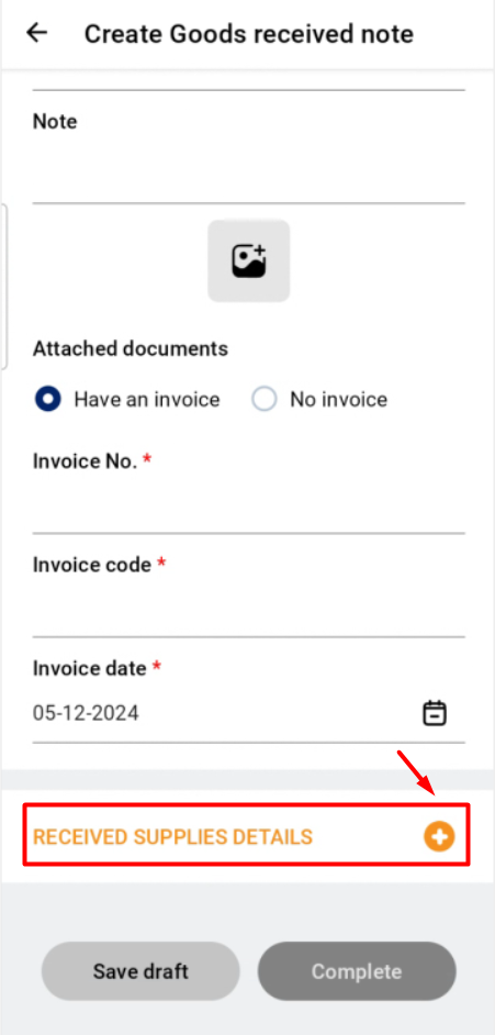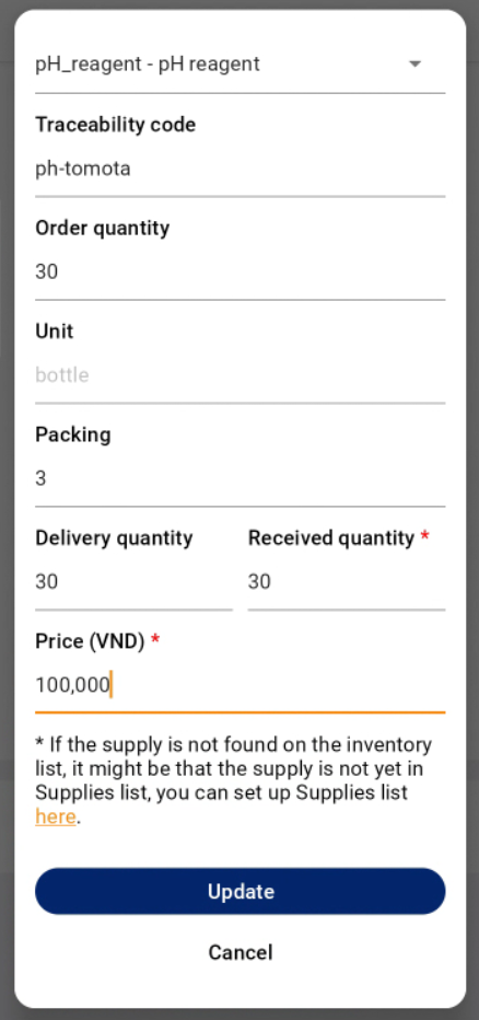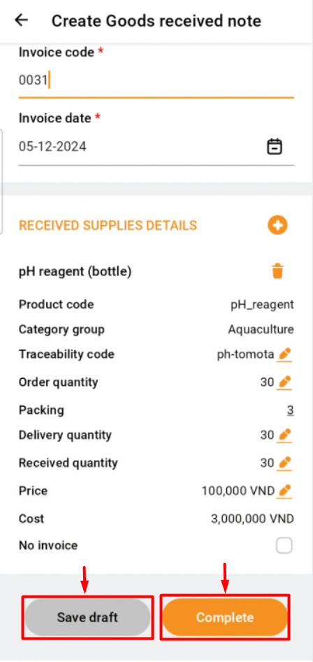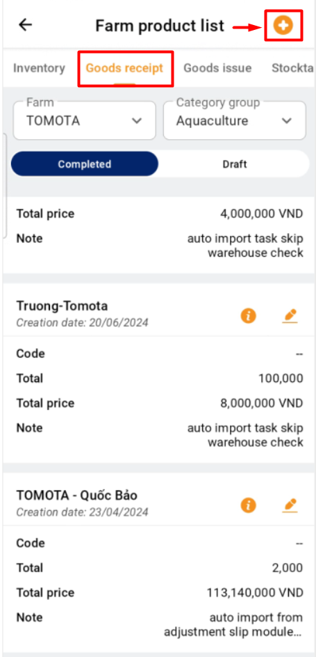 When you select "Complete", the receipt becomes effective, the products are added to the inventory of the farming area, and the receipt can no longer be edited or deleted, only viewed.