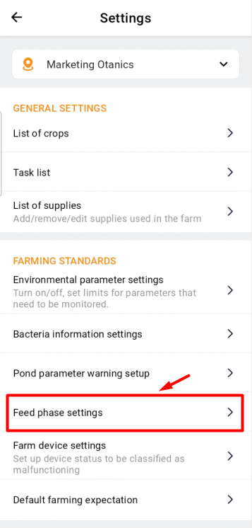 - Choose the farm you want to configure (1), and then click on “Feed phase settings” (2);