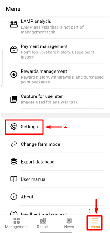 - Access the "Menu" (1) item, select “Settings” (2);